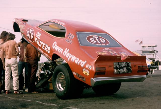 Owen Haywards first Funny Car drive was in the ex-Paula Murphy STP Car, which was purchased from the visiting US star in the mid Seventies. He took to the car like a duck takes to water and was soon campaigning the Plymouyth Duster bodied flopper as Houndog 7, alongside Nobby’s other Fuel Car, the Houndog 8 digger – the last Hills Fueller to date.